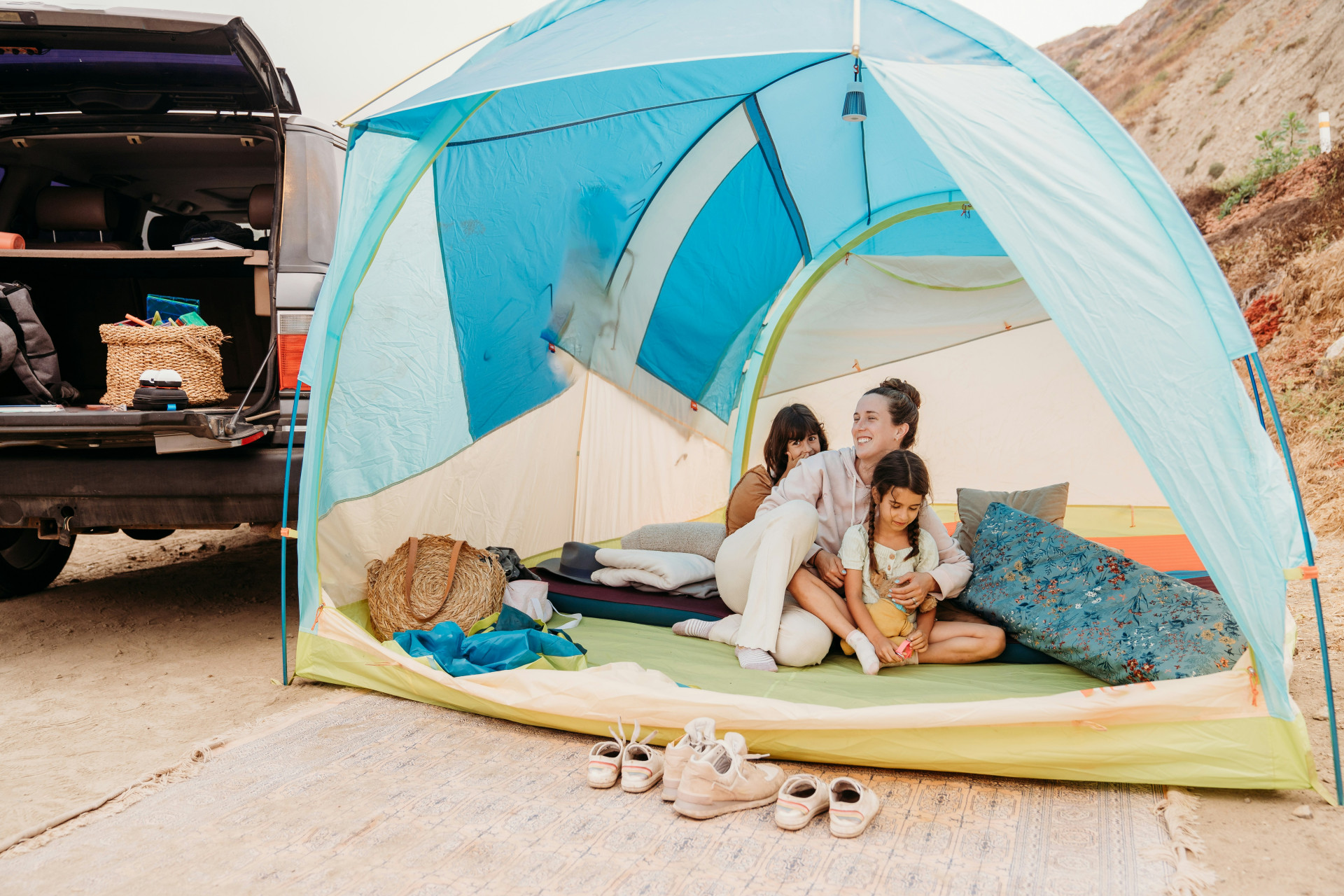 - Teltsætning: Mindre børn kan hjælpe med at holde pløkker eller finde sten til at stabilisere teltet. Større børn kan være med til at slå pløkker i eller rulle soveposer ud.